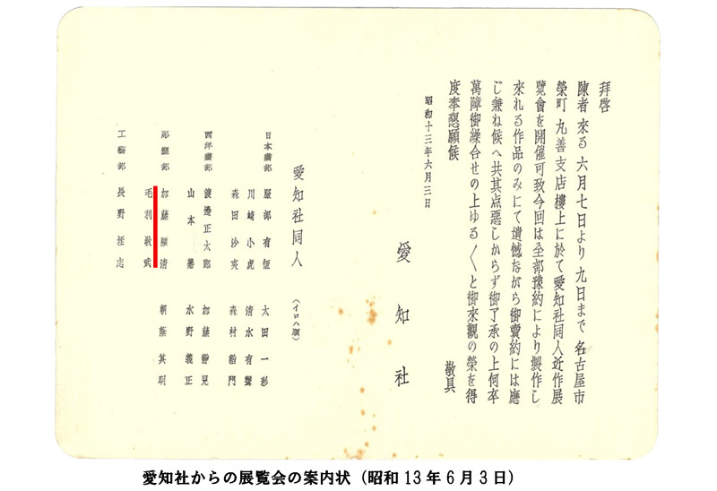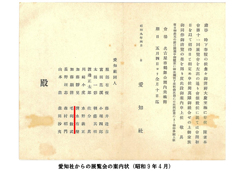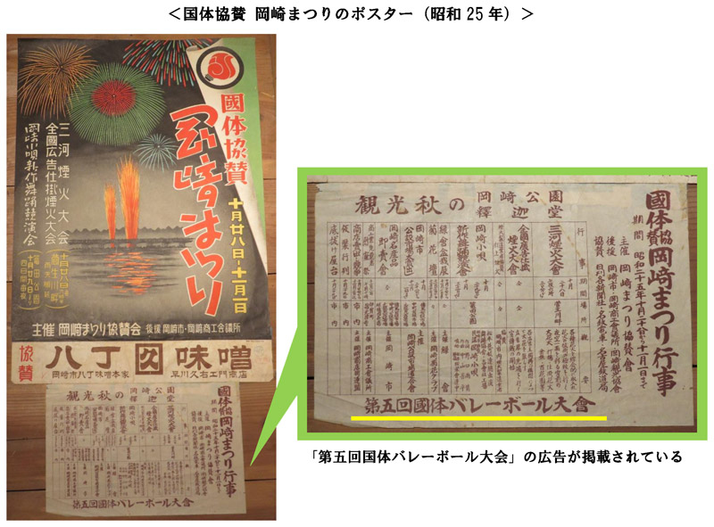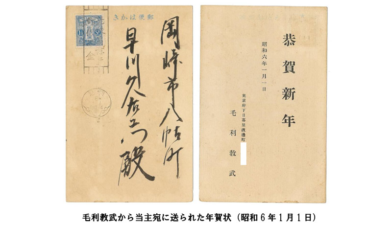 当社史料室には昭和時代に毛利教武から当主17代早川久右エ門宛にいただいた年賀状や、毛利教武の名前が掲載された愛知社の展覧会の案内状が残っています。また、第五回バレーボール大会の広告が掲載された「国体協賛 岡崎まつり」のポスターが残されています。