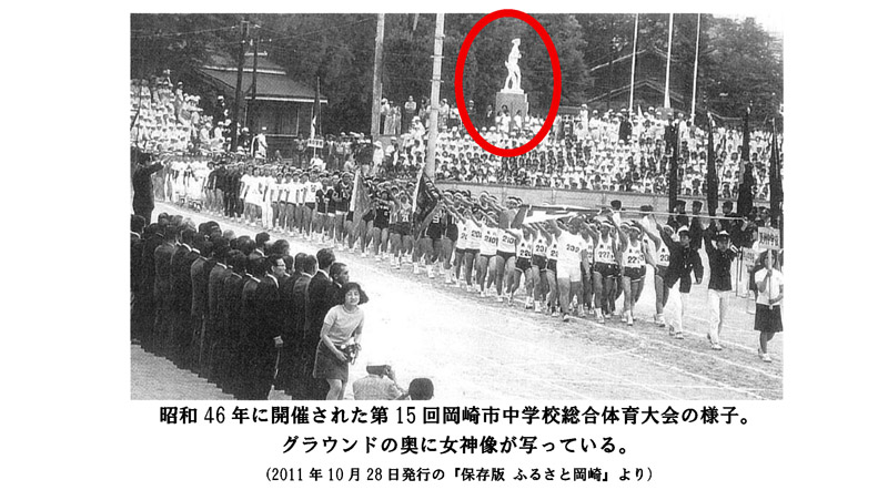 1950年(昭和25年)愛知県を中心に第5回国民体育大会(現・国民スポーツ大会)が開催され、岡崎公園(現・岡崎城公園)のコートでは10月28日~11月1日までバレーボール競技が開催されました。会場にはシンボルとして毛利教武の「前進」という女神像が建立されました。また同時に「国体協賛 岡崎まつり」も開催されました。