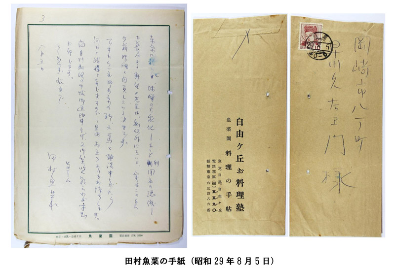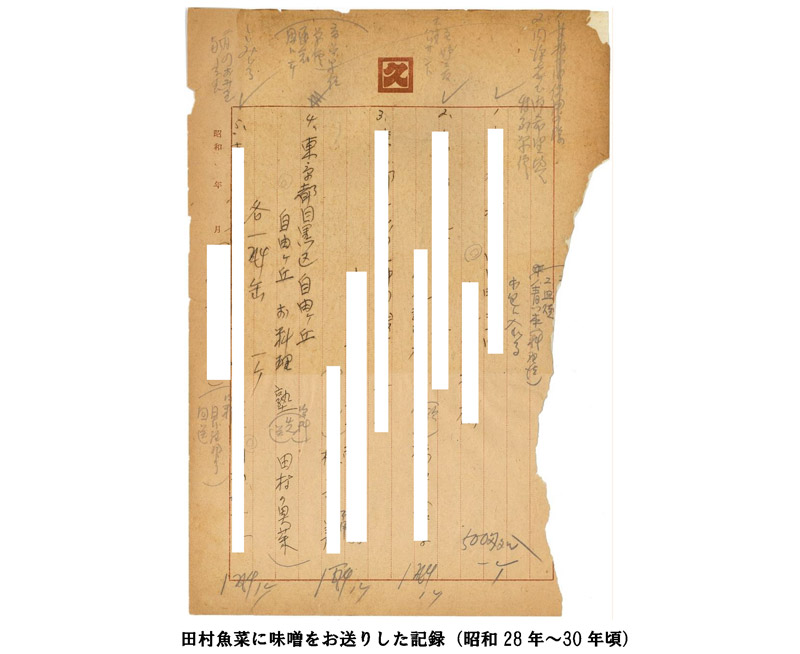 当社史料室には昭和時代に田村魚菜から当主宛に送られた手紙や味噌をお送りした記録が残っています。