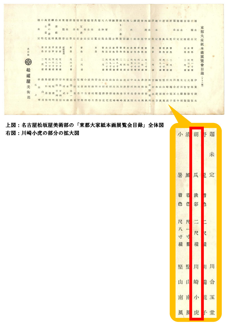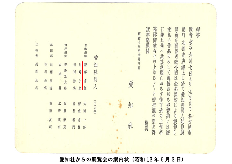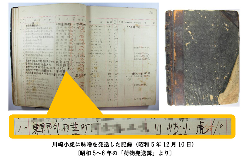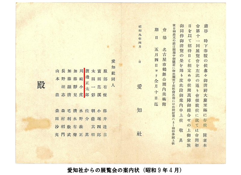 当社史料室には、昭和時代にお客様の御用命により川崎小虎に味噌をお送りした記録をはじめ、川崎小虎の作品が記載された名古屋松坂屋美術部や愛知社からの各種展覧会の案内状が残っています。