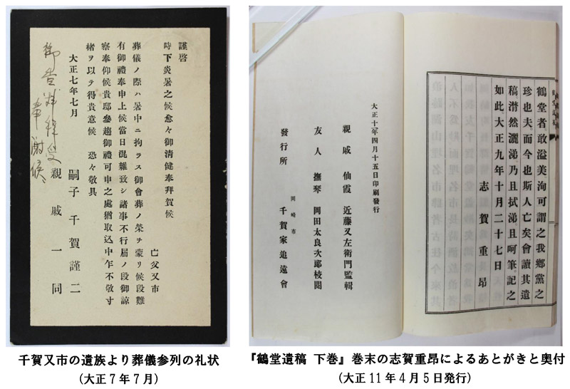 当社史料室には大正時代の汲古会発会式案内状、ハガキ、『鶴堂遺稿(上・下巻)』などが残っています。下巻には、志賀重昂があとがきを寄せています。